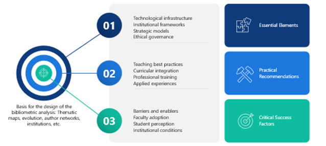 Together, these studies show that integrating AI into higher education requires ethical, strategic, and sustainable planning. Essential elements provide institutional foundations, practical recommendations guide action, and success factors explain outcomes. This review legitimizes the bibliometric approach of the study by clarifying key research areas, academic communities, and scientific production. Figure 1 visually summarizes the three subthemes explored.