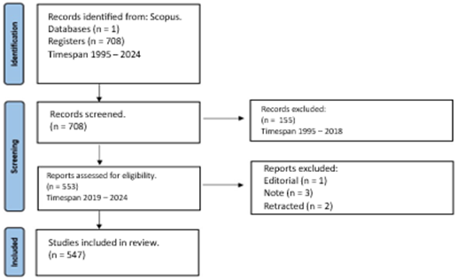 However, for this study, the sub-period 2019–2024 was selected, considering it represents the most recent and significant stage in terms of production and thematic evolution. The year 2025 was excluded from the main analysis as it is still ongoing. Documents were also screened by removing those classified as Note (3), Retracted (2), and Editorial (1), resulting in a final corpus of 627 valid documents, of which 547 correspond to the analyzed period (2019–2024). Figure 2 shows the inclusion and exclusion criteria for the search.