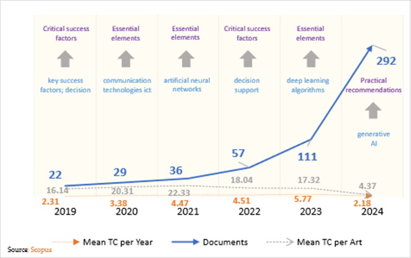 Concerning the second question (RQ2), the thematic analysis reveals a clear evolution of strategic subthemes between 2019 and 2024. Initially, critical success factors dominated the discussion, denoting a concern for understanding the necessary conditions for effective AI adoption. This result aligns with studies like that of Alzahrani et al. (2025), which identify institutional barriers, and Dhamija and Dhamija (2025), who analyze teacher attitudes towards AI as a determinant of success. Subsequently, from 2020, essential elements such as "communication technologies", "deep learning", and "artificial neural networks" gained prominence, reflecting a shift towards structural and technical aspects. This finding reaffirms what Medina-Gual and Parejo (2025), report, focusing on the technological implications of student autonomy, and by Jaboob et al. (2025), addressing ethical use policies for generative tools. Finally, in 2023 and 2024, practical recommendations emerged, driven by the widespread use of tools like ChatGPT. This was also observed by Alm (2024) and Michel-Villarreal et al. (2023), who highlight the role of generative AI in academic writing and evaluation. This thematic shift, although associated with a higher number of publications, shows a slight decline in average impact, which may be due to the novelty of the approaches and the need for more empirical validation. Collectively, a transition is observed from the "why" and "what" to the "how" to integrate AI into higher education institutions.