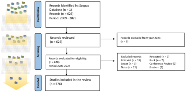 Data were retrieved from Scopus, a database recognized for its curated coverage and high quality (Baas et al., 2020; Kulkanjanapiban & Silwattananusarn, 2022; Pranckutė, 2021). The initial search in the "Article Title" field included the terms "digital transformation" OR "digitalization" OR "digital health" OR "healthcare digitization" AND "public health" OR "health system" OR "healthcare" OR "health services", yielding 843 documents. This was then refined within abstracts using the terms "telemedicine" OR "telehealth" OR "interoperability" OR "big data" OR "artificial intelligence" OR "AI" OR "digital public policy" OR "digital inclusion" OR "cybersecurity", reducing the number to 626 documents for the period 2009–2025. Subsequently, the range was limited to 2009–2024, resulting in 620 documents.