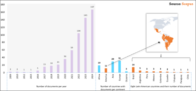 Figure 2. Documents by year, by continent, and by Latin American countries during 2009–2024.