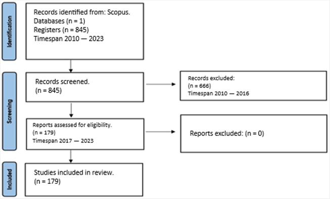 As exclusion criteria, duplicate documents and records without complete metadata (authors, year, country, or subject area) were removed. Applying these filters yielded a total of 179 publications. The data collection and cleansing process is summarized in Figure 1.